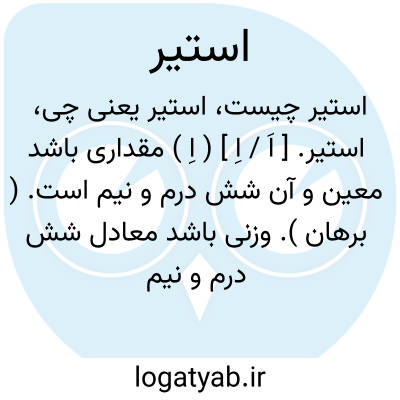استیر. [ اَ / اِ ] ( اِ ) مقداری باشد معین و آن شش درم و نیم است. ( برهان ). وزنی باشد معادل شش درم و نیم که چهار مثقال و نیم بود. ( رشیدی ). ستیر. ( لغت فرس اسدی ). استار. رجوع به استار و ستیر شود: