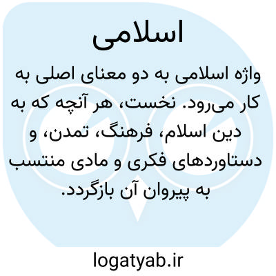 ( صفت ) ۱ - منسوب به اسلام آنچه از تمدن و فرهنگ و جز آن که منسوب به اسلام باشد. ۲ - پیرو اسلام مسلمان. جمع: اسلامیان. یا دور. اسلامی عهد اسلامی. دور. بعد از اسلام. یا قرون اسلامی. قرنهایی که از آغاز اسلام ببعد سپزی شده است.