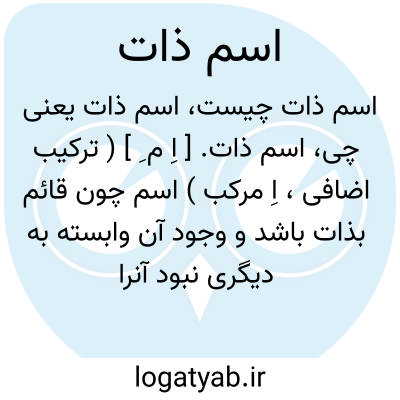 اسم ذات. [ اِ م ِ ] ( ترکیب اضافی، اِ مرکب ) اسم چون قائم بذات باشد و وجود آن وابسته به دیگری نبود آنرا اسم ذات نامند: جامه، نامه، مرد، زن، پسر، بلبل، باغ، پیل. و آن مقابل اسم معنی است. رجوع به اسم معنی شود.