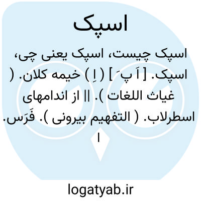 اسپک. [ اَ پ َ ] ( اِ ) خیمه کلان. ( غیاث اللغات ). || از اندامهای اسطرلاب. ( التفهیم بیرونی ). فَرَس. از اعضاء اسطرلاب. || پره و دندانه کلید: المغبن؛ جای اسپک کلید. المغرز؛ جای اسپک کلید. ( مهذب الاسماء ). و رجوع به اسبک شود.
