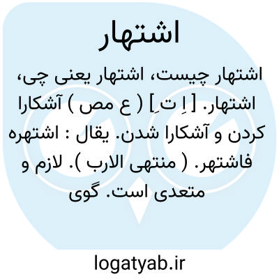 ( مصدر ) ۱ - آشکار گردیدن آوازه در افتادن. ۲ - نامبردار شدن معروف گردیدن. ۳ - ( اسم ) نامبرداری شهرت ناموری. جمع: اشتهارات.