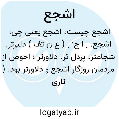 اشجع. [ اَ ج َ ] ( ع ن تف ) دلیرتر. شجاعتر. پردل تر. دلاورتر: احوص از مردمان روزگار اشجع و دلاورتر بود. ( تاریخ قم ص 245 ). اسم تفضیل است و منه المثل: اشجع من اسامة. ( اقرب الموارد ). || ( ص ) مرد سبک سر گول. || ( اِ ) شیر بیشه. || زمانه. ( منتهی الارب ). روزگار. دهر. || درازبالا و نیک دراز. ( منتهی الارب ). طویل. ( قطر المحیط ) ( اقرب الموارد ). || نوعی از مار. ( منتهی الارب ). ج، شُجُع. ( قطر المحیط ). || پیوند بن انگشتان متصل به پی پشت دست و پا، یا پی پشت دست ازبند دست تا بن انگشتان، یا استخوان انگشت زیر پی پشت دست ملتصق به بند دست. ج، اَشاجع. ( منتهی الارب ).
