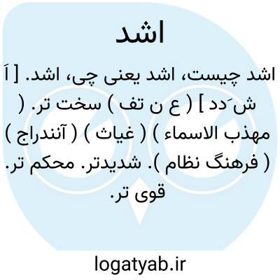 اشد. [ اَ ش َدد ] ( ع ن تف ) سخت تر. ( مهذب الاسماء ) ( غیاث ) ( آنندراج ) ( فرهنگ نظام ). شدیدتر. محکم تر. قوی تر. صعب تر. و فی الحدیث: اَشَدّهُم [ ای اَشَدﱡ امتی ] فی دین اﷲ عمر. و در ترکیباتی نظیر: اَشَدُّ حمرةً و غیره بمعنی بسیار باشد و بجای «تر» علامت صفت تفضیلی فارسی به اول مصادری درآید که شرایط اشتقاق صفت تفضیلی از آنها در عربی ممکن نیست.