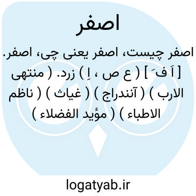 اصفر. [ اَ ف َ ] ( ع ص، اِ ) زرد. ( منتهی الارب ) ( آنندراج ) ( غیاث ) ( ناظم الاطباء ) ( مؤید الفضلاء ) ( مهذب الاسماء ). آنچه رنگ صُفْرة داشته باشد یعنی همچون زعفران و زر زردرنگ باشد. ( از اقرب الموارد ) ( از قطر المحیط ):
