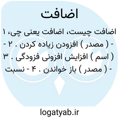 ۱ - ( مصدر ) افزودن زیاده کردن. ۲ - ( اسم ) افزایش افزونی فزودگی. ۳ - ( مصدر ) باز خواندن. ۴ - نسبت دادن کلمه ایست بکلم. دیگر برای تتمیم معنی. نخستین را مضاف و دوم را مضاف الیه گویند: کتاب جمشید مرغ هوا جلد دفتر لب لعل. علامت اضافه کسره ایست ( ) که باخر مضاف ملحق شود. اضافه شامل اقسام ذیل است: یا اضاف. ملکی. معنی مالکیت را رساند: کتاب یوسف خان. حسن. یا اضاف. تخصیصی. اختصاص را رساند: زین اسب سقف اطاق زنگ شتر یا اضاف. بیانی. آنست که مضاف الیه نوع و جنس مضاف را بیان کند: ظرف مس انگشتری طلا آوند سفال. یا اضاف. تشببهی. آنست که در وی معنی تشبیه باشد و آن بر دو قسم است: الف - اضاف. مشبه بمشبه به: قد سرو لب لعل. ب - اضافه مشبه به بمشبه: فراش باد بنات نبات مهد زمین. یا اضاف. استعاری. آنست که مضاف در غیر معنی حقیقی خود استعمال شده باشد و بعبارت دیگر مضاف الیه بچیزی تشبیه شده باشد که بجای آن چیز یکی از لوازم و اجزای آن مذکور گردد: روی سخن گوش هوش دست اجل. ۵ - حامل. ۶ - نسبت. جمع: اضافات.