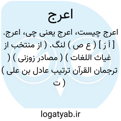 اعرج. [ اَ رَ ] ( ع ص ) لنگ. ( از منتخب از غیاث اللغات ) ( مصادر زوزنی ) ( ترجمان القرآن ترتیب عادل بن علی ) ( تاج المصادر بیهقی ) ( مؤید الفضلاء ). سخت لنگ.( منتهی الارب ) ( ناظم الاطباء ) ( آنندراج ). مُقعِد. ( بحر الجواهر ). لنگ. شل. مؤنث: عَرْجاء. ( از یادداشت بخط مؤلف ). ج، عُرج، عُرجان. ( منتهی الارب ) ( ناظم الاطباء ) ( آنندراج ): لیس علی الاعمی حرج و لا علی الاعرج حرج و لا علی المریض حرج و لا علی انفسکم... ( قرآن 61/24 ). لیس علی الاعمی حرج و لا علی الاعرج حرج و لا علی المریض حرج و من یطع اﷲ و رسوله... ( قرآن 17/48 ).