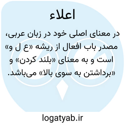 در معنای اصلی خود در زبان عربی، مصدر باب افعال از ریشه «ع ل و» است و به معنای «بلند کردن» و «برداشتن به سوی بالا» میباشد. این واژه در متون کلاسیک فارسی مانند «آنندراج»، «تاج المصادر بیهقی»، و «منتهی الارب» به معنای «بلند گردانیدن» یا «بالا بردن چیزی» ثبت شده است. کاربرد رایج این مفهوم در حوزه اعتبار و منزلت، اشاره به «اعلاء مرتبت» و «اعلاء درجه» دارد، چنانکه در ترجمهٔ تاریخ یمینی آمده است: «سلطان از جهت رفع درجت و اعلای مرتبت...» و همچنین در مفهوم «اعلاء کلمه» که به معنای بلندآوازه و آشکار ساختن حق یا سخن است، مانند عبارت: «همت ملکانه را بر اعلاء کلمةالحق مقصور گردانید.»