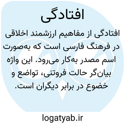 افتادگی از مفاهیم ارزشمند اخلاقی در فرهنگ فارسی است که به‌صورت اسم مصدر به‌کار می‌رود. این واژه بیان‌گر حالت فروتنی، تواضع و خضوع در برابر دیگران است و در متون کهن و فرهنگ‌نامه‌های معتبری چون ناظم‌الاطباء و آنندراج بر این معانی تأکید شده است. در گسترهٔ معنایی، افتادگی علاوه بر فروتنی و تواضع، به‌عنوان معادلی برای خضوع، بی‌شرارتی و صفتِ افتادن نیز شناخته می‌شود. همچنین در کاربردهای هم‌معنا می‌توان آن را با عباراتی چون پشت خم دادن، پشت خم کردن، پشت دوتا کردن، تواضع کردن و انکساری مقایسه نمود. این خصیصهٔ اخلاقی در ادبیات فارسی همواره به‌عنوان ویژگی‌ای پسندیده و نشانهٔ بزرگ‌منشی مورد ستایش قرار گرفته است. رعایت افتادگی نه تنها در روابط اجتماعی، بلکه در سلوک فردی نیز عاملی در جهت حفظ تعادل و احترام متقابل محسوب می‌شود.
