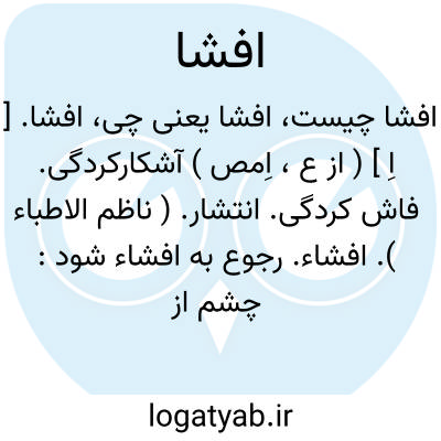 افشا. [ اِ ] ( از ع، اِمص ) آشکارکردگی. فاش کردگی. انتشار. ( ناظم الاطباء ). افشاء. رجوع به افشاء شود: چشم از عوایب زیردستان بپوشند و در افشای جرایم کهتران نکوشند. ( گلستان ).