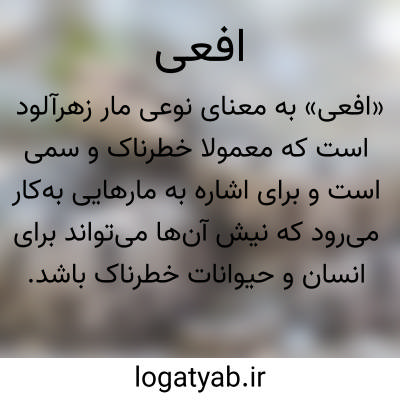 کلمهی «افعی» در فارسی به معنای نوعی مار زهرآلود است که معمولا خطرناک و سمی است. این واژه در متون ادبی و علمی برای اشاره به مارهایی بهکار میرود که نیش آنها میتواند برای انسان و حیوانات خطرناک باشد. «افعی» به دلیل طبیعت مخفی و حمله ناگهانیاش، نمادی از حیلهگری، خطر و خیانت در ادبیات و ضربالمثلهای فارسی نیز شده است. این مار معمولاً دارای بدن باریک، سر مثلثی و چشمهای تیز است و در محیطهای خشک و کوهستانی زندگی میکند. در ادبیات و اشعار فارسی، افعی گاهی به عنوان نماد دشمن پنهان، فریبکار یا فردی با نیت سوء به کار میرود. از نظر علمی، افعیها عضو خانوادهی Viperidae هستند و انواع مختلفی دارند که در مناطق گرمسیر و معتدل یافت میشوند.