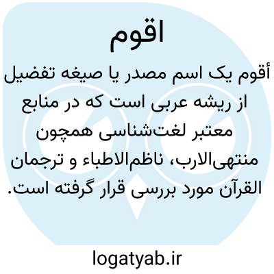 أقوم یک اسم مصدر یا صیغه تفضیل از ریشه عربی است که در منابع معتبر لغتشناسی همچون منتهیالارب، ناظمالاطباء و ترجمان القرآن مورد بررسی قرار گرفته است. معنای محوری و اساسی این واژه، دلالت بر حالت تفضیلی صواب و استقامت دارد؛ یعنی چیزی که راستتر، صحیحتر و قویمتر از حالت عادی یا مبنا باشد. این مفهوم بیانگر درجهای از اتقان و درستی است که از حالت معیار فراتر رفته است.