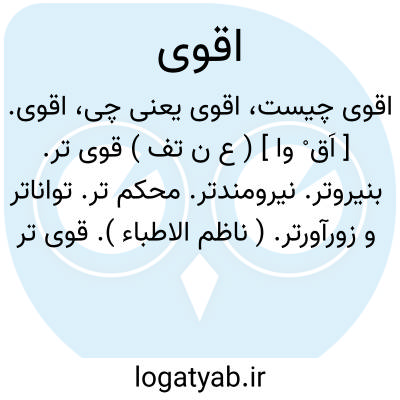 اقوی. [ اَق ْ وا ] ( ع ن تف ) قوی تر. بنیروتر. نیرومندتر. محکم تر. تواناتر و زورآورتر. ( ناظم الاطباء ). قوی تر و زورمندتر. ( غیاث اللغات ) ( آنندراج ): از ارکان امیر یوسف الدین که رکن اقوی بود. ( جهانگشای جوینی ).