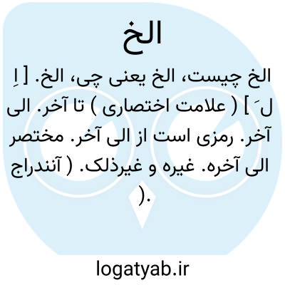 الخ. [ اِ ل َ ] ( علامت اختصاری ) تا آخر. الی آخر. رمزی است از الی آخر. مختصر الی آخره. غیره و غیرذلک. ( آنندراج ). دزی گوید: در خواندن آنرا الی آخره میخوانند ولی در تداول عامه اَلِّخ گویند.