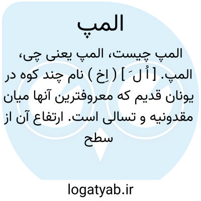 المپ. [ اُ ل َ ] ( اِخ ) نام چند کوه در یونان قدیم که معروفترین آنها میان مقدونیه و تسالی است. ارتفاع آن از سطح دریا 2885 متر، و بنا بروایات افسانه ای این کوه اقامتگاه خدایان بوده است، و امروزه المپوس گویند. و رجوع به ایران باستان ص 69 و 624 و 752 و 767 و 768 و 797 و 800 و 1190 و 1216 و 1975 و 2689 شود.