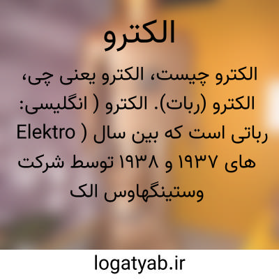 الکترو (ربات). الکترو ( انگلیسی: Elektro ) رباتی است که بین سال های ۱۹۳۷ و ۱۹۳۸ توسط شرکت وستینگهاوس الکتریک در تأسیسات این شرکت در منسفیلد، اوهایو، ساخته شد. این ربات دارای ۲٫۱ متر ( ۷ فوت ) قد و ۱۲۰ کیلوگرم ( ۲۶۵ پوند ) وزن بود، از نظر ظاهری انسان نما بود و می توانست با فرمان صوتی راه برود، حدود ۷۰۰ کلمه صحبت کند ( با استفاده از دستگاه پخش ۷۸ دور بر دقیقه ای )، سیگار بکشد، بادکنک ها را منفجر کند و سر و دست هایش را حرکت دهد. بدنهٔ الکترو از یک چرخ دندهٔ فولادی، بادامک و اسکلت موتوری تشکیل شده بود که توسط یک پوستهٔ آلومینیومی پوشانده شده بود. «چشم های» فوتوالکتریک او می توانستند نور قرمز و سبز را تشخیص دهند. او در نمایشگاه جهانی نیویورک در سال ۱۹۳۹ حضور داشت و در سال ۱۹۴۰ نیز به همراه «اسپارکو»، سگ رباتیکی که می توانست پارس کند، بنشیند و به انسان التماس کند، دوباره در آن نمایشگاه ظاهر شد.