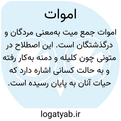 واژه‌ی اموات جمع میت به‌معنی مردگان و درگذشتگان است. این اصطلاح در متونی چون کلیله و دمنه به‌کار رفته و به حالت کسانی اشاره دارد که حیات آنان به پایان رسیده است. در این متون، گاه مفاهیمی مانند عدالت و حیات مجدد در ارتباط با اموات مطرح می‌شود. عبارت اموات احمر به‌صورت کنایی برای اشاره به کشته‌شدگان و شهیدان استفاده می‌شود. این اصطلاح در فرهنگ‌هایی مانند غیاث‌اللغات و آنندراج ثبت شده و بیانگر مفهومی نمادین و مبتنی بر تقدس و احترام است. همچنین واژه‌ی اموات به‌عنوان جمع امة به‌معنی کنیزان و خدمتکاران زن نیز به‌کار رفته است. این معنا در منابعی مانند ناظم‌الاطباء و آنندراج ذکر شده و نشان‌دهنده‌ی کاربرد چندوجهی این لغت در زبان و ادبیات فارسی است.