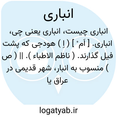 انباری. [ اَم ْ ] ( اِ ) هودجی که پشت فیل گذارند. ( ناظم الاطباء ). || ( ص ) منسوب به انبار، شهر قدیمی در عراق یا منسوب به سکةالانبار نام کوچه ای در مرو. ( از منتهی الارب ). || انباربان. انباردار. رجوع به انباردار شود. || پُرکن. ( شرفنامه منیری ) ( مؤید الفضلاء ).