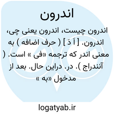 اندرون. [ اَ دَ ] ( حرف اضافه ) به معنی اندر که ترجمه «فی » است. ( آنندراج ). در. دراین حال. بعد از مدخول «به » می آید و آنرا تفسیر میکند مانند بخاک اندرون [ = اندر( در ) خاک ]: