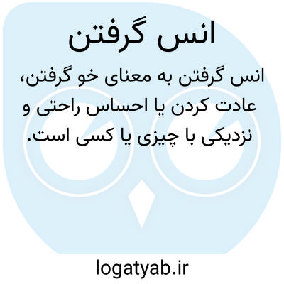 انس گرفتن به معنای خو گرفتن، عادت کردن یا احساس راحتی و نزدیکی با چیزی یا کسی است. این اصطلاح معمولاً برای بیان حالتی به کار می‌رود که فرد با شخص، مکان، شیء یا حتی فعالیتی احساس آشنایی، آرامش و راحتی پیدا می‌کند و حضور یا انجام آن برایش خوشایند و دلپذیر می‌شود. انس گرفتن علاوه بر بعد روانی، می‌تواند بعد رفتاری و اخلاقی نیز داشته باشد و نشان‌دهنده ارتباط عمیق و مثبت فرد با محیط یا موجود مورد نظر باشد.