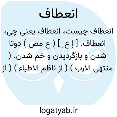 ۱ - ( مصدر ) دو تا شدن خم گرفتن کج شدن. ۲ - بر گشتن باز گشتن. ۳ - ( اسم ) خمیدگی. ۴ - ( اسم ) خم. جمع: انعطافات. یا قابلیت انعطاف. ۱ - خم پذیری. ۲ - شایستگی هماهنگی با هر وضع و هر محیط.