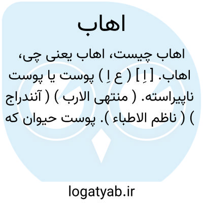 اهاب. [ اِ ] ( ع اِ ) پوست یا پوست ناپیراسته. ( منتهی الارب ) ( آنندراج ) ( ناظم الاطباء ). پوست حیوان که آنرا دباغت نکرده باشند یا پوست مطلق. ( منتخب از غیاث اللغات ). نام است پوست دباغت ناشده را. ( از تعریفات جرجانی ). پوست ناپیراسته. ( مهذب الاسماء نسخه خطی ). پوست خام. پوست بی دباغت. پوست آش نکرده. ( یادداشت بخط مرحوم دهخدا ). ج، آهِبَة. اُهُب. اَهَب. ( منتهی الارب ) ( ناظم الاطباء ):