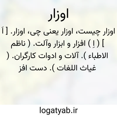 اوزار. [ اَ ] ( اِ ) افزار و ابزار وآلت. ( ناظم الاطباء ). آلات و ادوات کارگران. ( غیاث اللغات ). دست افزار پیشه وران. ( هفت قلزم ) ( آنندراج ) ( برهان ) ( انجمن آرا ). || کفش. ( هفت قلزم ) ( ناظم الاطباء ). پاپوش. ( ناظم الاطباء ). || بادبان کشتی. ( آنندراج ) ( ناظم الاطباء ) ( هفت قلزم ) ( برهان ) ( انجمن آرا ). || دیگ افزار. توابل. ( از ناظم الاطباء ). داروی گرم مثل فلفل و دارچینی و زیره و غیره که در دیگ طعام ریزند. ( برهان ) ( هفت قلزم ).