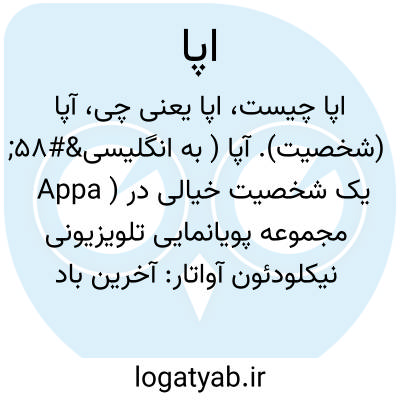 آپا (شخصیت). آپا ( به انگلیسی: Appa ) یک شخصیت خیالی در مجموعه پویانمایی تلویزیونی نیکلودئون آواتار: آخرین بادافزار و در فیلم آخرین بادافزار است. در این مجموعه، آپا تنها گاومیش پرنده دم - تخت آسمانی زنده شناخته شده است، گونه ای از حیوانات که می توانند به طور طبیعی پرواز کنند، و راهنمای روح حیوانی قهرمان داستان، آنگ است. دی بردلی بیکر صداپیشگی آپا را به همراه تمام حیوانات دیگر در سریال تلویزیونی و فیلم بر عهده دارد.