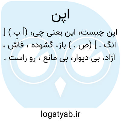 (اُ پِ ) [ انگ. ] (ص. ) باز، گشوده، فاش، آزاد، بی دیوار، بی مانع، رو راست.