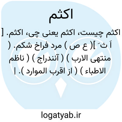 اکثم. [ اَ ث َ ]( ع ص ) مرد فراخ شکم. ( منتهی الارب ) ( آنندراج ) ( ناظم الاطباء ) ( از اقرب الموارد ). || آسوده سیرشکم. ( منتهی الارب ) ( ناظم الاطباء ) ( از آنندراج ). سیرشکم. ( از اقرب الموارد ). || زهار فربه و پرگوشت. ( منتهی الارب ) ( ناظم الاطباء ) ( آنندراج ). || راه فراخ. ( ناظم الاطباء ) ( از اقرب الموارد ).