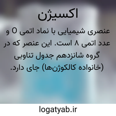 عنصری بی رنگ، بی بو، بی مزه، غیرفلزی، گازی شکل، با نماد O، عدد اتمی ۸، و جرم اتمی نسبی ۱۵.۹۹۹۴. فراوان ترین عنصر در پوستۀ زمین، تقریباً ۵۰ درصد وزنی، و سازندۀ حدود ۲۱درصد حجم جو است. این عنصر به شکل ترکیبی در آب و سایر مواد نیز یافت می شود. اکسیژن فرآوردۀ جانبی فتوسنتز است و اساس تنفس سلولی در گیاهان و جانوران را تشکیل می دهد. اکسیژن عنصری بسیار کُنِشگر است و جز با گازهای نادر و فلوئور، با همۀ عناصر دیگر ترکیب می شود. اکسیژن در دی اکسیدکربن، دی اکسید سیلیسیم (کوارتز)، سنگ آهن، و کربنات کلسیم (سنگ آهک) نیز یافت می شود. در طبیعت، به شکل مولکولی دو اتمی (O۲) است و اتم های منفرد آن به علت واکنشگری بسیار عمر کوتاهی دارند. اتم های منفرد ممکن است بر اثر جرقۀ الکتریکی و پرتوهای فرابنفش خورشید در جو کرۀ فوقانی پدید آیند. در آن جا، با مولکول اکسیژن ترکیب می شوند و اُزون را پدید می آورند. اکسیژن مصرفی در صنعت، با تقطیر جزء به جزء هوای مایع، الکترولیز آب یا گرم کردن اکسید منگنز (IV) با کلرات پتاسیم به دست می آید. اکسیژن برای احتراق ضروری است و با اتین (استیلن) نیز برای جوش دادن در دمای بالا و مشعل های برش به کار می رود. این عنصر را نخستین بار شیمی دان انگلیسی، جوزف پریستلی در ۱۷۷۴ و در همان سال شیمی دان سوئدی، کارل شِله، مستقلاً کشف کردند. در ۱۷۷۷، شیمی دان فرانسوی، آنتوان لاوازیه، آن را نام گذاری کرد.