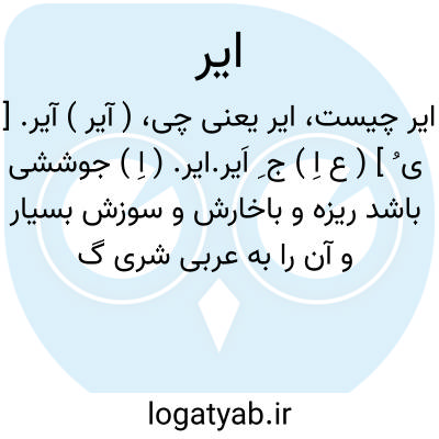 ایر. ( اِ ) جوششی باشد ریزه و باخارش و سوزش بسیار و آن را به عربی شری گویند. ( برهان ). جوششی باشد ریزه و با خارش و سوزش که بسبب خون به صفرا آمیخته شده بشره را سرخ گرداند و بعربی شری گویند. ( آنندراج ) ( انجمن آرا ). دانه های خرد که بر اندام برآید و خارش و سوزش بسیار کند و به عربی شری گویند. ( رشیدی ). جوششی ریزه و با خارش که بر بدن آدمی برآید ونبات اللیل گویند. ( ناظم الاطباء ). || دمل. ( برهان ) ( هفت قلزم ) ( آنندراج ) ( انجمن آرا ).