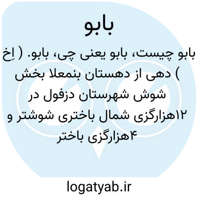بابو. ( اِخ ) دهی از دهستان بنمعلا بخش شوش شهرستان دزفول در 12هزارگزی شمال باختری شوشتر و 4هزارگزی باختر راه شوسه اهواز به دزفول. دشت،گرم سیر مالاریائی. دارای 200تن سکنه است. آب آن از رودخانه کرخه و محصول آن غلات، برنج و کنجد و شغل اهالی زراعت میباشد. راه در تابستان اتومبیل رو. ساکنین از طایفه لر هستند. ( فرهنگ جغرافیائی ایران ج 6 ).