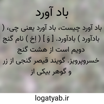 ( بادآورد ) بادآورد. [ وَ ] ( اِخ ) نام گنج دویم است از هشت گنج خسروپرویز. گویند قیصر گنجی از زر و گوهر بیکی از جزایر حصینه میفرستاد اتفاقاً باد کشتی را بحوالی اردوی خسروپرویز آورد و او آنرا متصرف شد و باین نام موسوم گشت. ( برهان: بادآور ) ( آنندراج ) ( غیاث ) ( انجمن آرا ) ( سروری ) ( جهانگیری ) ( رشیدی ) ( ناظم الاطباء ):