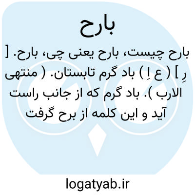 بارح. [ رِ ] ( ع اِ ) باد گرم تابستان. ( منتهی الارب ). باد گرم که از جانب راست آید و این کلمه از برح گرفته شده که بمعنی امر شدید شگفت آور است. ( المعرب جوالیقی ص 65 ). و احمد محمد شاکر در حاشیه آرد: برح بمعنی شدت و اذیت است و آنچه جوالیقی نوشته پیروی از استادش تبریزی است. و من در آثار گذشتگان این معنی را نیافتم. || باد تند گردناک. ج، بوارح. ( منتهی الارب ): ریح بارح؛ شدید. ( از اقرب الموارد ). باد شدیدی که غبار برانگیزد. ( از جمهره ابن درید 1: 218 ). طوفان. ( دِمزن ). || بمعنی بروح ضد سانح و العرب تتطیربالبارح و تتفأل بالسانح لانه لایمکنک ان ترمیه حتی تنحرف. ( منتهی الارب ). || و در مثل است: انما هو کبارح الاروی؛ در حق کسی گویند که از او احسان بندرت بوقوع آید، زیرا که اروی یعنی بز کوهی که بر قله جبال سکونت دارد و کسی او را نبیند مگر گاهی در سالهای دراز. ( منتهی الارب ). صیدی که از جانب راست آدمی میآید مانند بروح. ج، بوارح و عرب بدان فال بد زند زیرا نمیتوان بدان تیر انداخت جز هنگامی که انسان منحرف شود. ( از اقرب الموارد ). مقابل سانح. صید که از جانب راست صیاد درآید و عرب آنرا شوم دارد. شکاری که از جانب راست صیاد بسوی چپ گذرد. خلاف سانح. ( آنندراج ). بداقبال. از بخت بد. ( دِمزن ): و در انتظار سانح و بارح و نازح و سارح مانده. ( سندبادنامه ص 259 ).