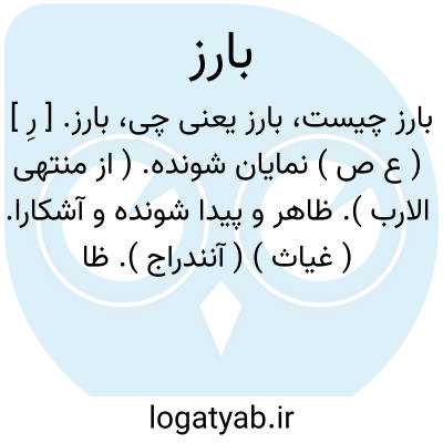 بارز. [ رِ ] ( ع ص ) نمایان شونده. ( از منتهی الارب ). ظاهر و پیدا شونده و آشکارا. ( غیاث ) ( آنندراج ). ظاهر و آشکارا و نمایان و هویدا. ( ناظم الاطباء ) ( دِمزن ). نمودار. روشن. پدیدار. پدیدشونده. ظهورکننده. لامح. رجوع به بارز شدن شود. || برآینده بسوی فضا. ( ناظم الاطباء ). آنکه میجهد. || برجسته. برآمده. || برون. خارج. ( دِمزن ). || ( اصطلاح حساب ) جمع کل. ( ناظم الاطباء ). || ضمیر بارز ( در صرف عربی ) در مقابل ضمیر مستتر است و عبارتند از ضمایر متصل مرفوع: