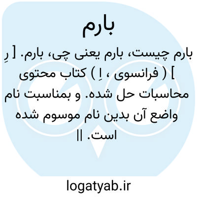 بارم. [ رِ ] ( فرانسوی، اِ ) کتاب محتوی محاسبات حل شده. و بمناسبت نام واضع آن بدین نام موسوم شده است. || ریز نمرات مخصوص آزمایش یک پرسش. برای بدست آوردن معدل نمرات یک آزمایش پرسش ها را به اجزایی چند تقسیم و برای هر جزء نمره ای تعیین میکنند، نمره مزبور را در اصطلاح بارم خوانند.