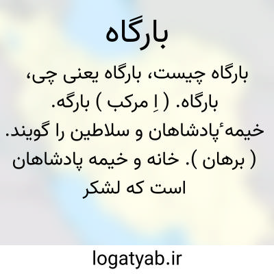 بارگاه. ( اِ مرکب ) بارگه. خیمه ٔپادشاهان و سلاطین را گویند. ( برهان ). خانه و خیمه پادشاهان است که لشکر و سپاه و غیره بسلام آیند. ( آنندراج ). نوعی از خیام مراتب ملوک و سلاطین. ( شرفنامه منیری ). خیمه سخت بزرگ که بر در خرگاه ملوک و سلاطین زنند. ( صحاح الفرس ). در زبان عرف بمعنی اطاق پادشاهان است. ( شعوری ج 1 ورق 191 ). خانه و خیمه پادشاهان است که لشکر و سپاه و غیره بسلام آیند و آن معروف است. رجوع به بارگه شود: پس در خیمه بارگاه بنشست و عمش را بر دست راست بنشاند. ( فارسنامه ابن البلخی چ لیدن ص 46 ).