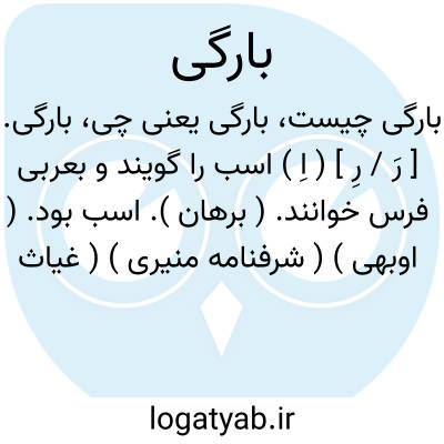 بارگی. [ رَ / رِ ] ( اِ ) اسب را گویند و بعربی فرس خوانند. ( برهان ). اسب بود. ( اوبهی ) ( شرفنامه منیری ) ( غیاث ) ( ناظم الاطباء ) ( دِمزن ) ( فرهنگ اسدی چ عباس اقبال صص 151-516 ) ( حاشیه فرهنگ اسدی خطی نخجوانی ) ( انجمن آرا ) ( آنندراج ) ( معیار جمالی ) ( جهانگیری ). بارگیر باشد یعنی اسب. ( صحاح الفرس ). باره. ( شرفنامه منیری ). بالایی. ( شرفنامه منیری ).حَمولَه. حمول. مرکب. وَلیَّه. مَطِیَّه. امطاء، امتطاء؛ بارگی ساختن ستور را. ( منتهی الارب ):