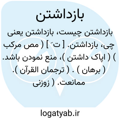بازداشتن. [ ت َ ] ( مص مرکب ) ( اپاک داشتن )، منع نمودن باشد. ( برهان ). ( ترجمان القرآن ). ممانعت. ( زوزنی ). منع کردن. ( آنندراج ). عَصر. غَرض. عَفس. عَفک. عُرَس. عَجس. تعکیظ. اِلتحاص. صَری. اجذا. اِعتام. عَذب. اِعدام. اِعذاب. صَبن. تعجیز. جَعظ. دَقل. دَقن. منع. ذَب. ذَأذَاءة. تَذه ذُوء. تمنیع. خطّ. تقلید. شَمظ؛ بازداشتن کسی را از چیزی و برگردانیدن. ( منتهی الارب ). حجابة. حَجب. حجاب. حَصر. حَظر. ثَنی. ( دهار ). احکام. حبس. صبر. حجز. عَزب. حَد. حَصر. تبر. قصر. کفکفه. لیت. ضبن. عوق. عَجس. تعویذ. ( تاج المصادر بیهقی ). مانع شدن. ممنوع داشتن. جلوگیری کردن: