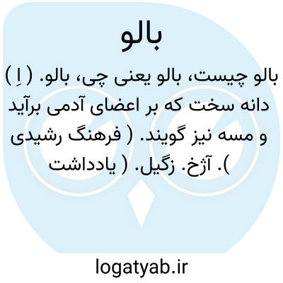 بالو. ( اِ ) دانه سخت که بر اعضای آدمی برآید و مسه نیز گویند. ( فرهنگ رشیدی ). آژخ. زگیل. ( یادداشت مؤلف ). ثؤلول گویند به تازی. ( فرهنگ اسدی ). اژخ و آن دانه های سخت باشد که در اعضای آدمی بر می آید و درد نمی کند. ( آنندراج ) ( برهان قاطع ). ژخ. ( شرفنامه منیری ). در بعضی از ولایات فارس و عراق عجم کورک خوانند و به تازی ثؤلول و به تبریزی سکیل و به ترکی کونیک و بهندی مسا گویند. ( فرهنگ جهانگیری ). زگیل. مهک.چیزی بود چند عدسی که از تن مردم برآید. ( حاشیه فرهنگ اسدی ). ازخ. ( ناظم الاطباء ). دانه های سختی که بر اعضای انسان بیرون می آید که درد ندارد و پخته هم نمیشود و نام دیگرش آزخ است. ( فرهنگ نظام ):