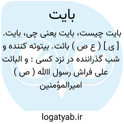 بایت. [ ی ِ] ( ع ص ) بائت. بیتوته کننده و شب گذراننده در نزد کسی: و البائت علی فراش رسول اﷲ ( ص ) امیرالمؤمنین علی بن ابی طالب. ( از ناظم الاطباء ). و رجوع به بائت شود.