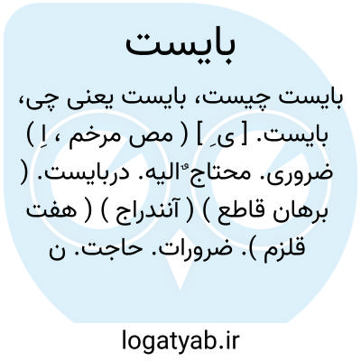 بایست. [ ی ِ ] ( مص مرخم، اِ ) ضروری. محتاج ٌالیه. دربایست. ( برهان قاطع ) ( آنندراج ) ( هفت قلزم ). ضرورات. حاجت. نیاز. ( شرفنامه منیری ). لزوم. ( از فرهنگ شعوری ج 1 ورق 152 ). اندروا. دروا. تلنگ. اوایا. ( شرفنامه منیری ). قابل لزوم چیزی. ( غیاث اللغات ). برابر نابایست: