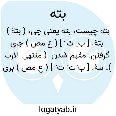 بته. [ ب َ ت َ ] ( اِ ) سنگی است که در روی آن بعضی چیزها صلایه نمایند. بتو نیز گویند. ( از فرهنگ شعوری ج 1 ورق 193 ). سنگی باشد که بدان داروها سایند. مقمع. ( برهان قاطع ) ( آنندراج ). دسته ٔهاون. ( ناظم الاطباء ). || پلو ساده و خشک.بده. ( از فرهنگ شعوری ). خشکه پلاو. ( ناظم الاطباء ).
