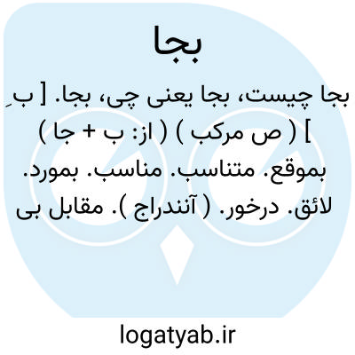 بجا. [ ب ِ ] ( ص مرکب ) ( از: ب + جا ) بموقع. متناسب. مناسب. بمورد. لائق. درخور. ( آنندراج ). مقابل بی جا. مقابل نابجا: