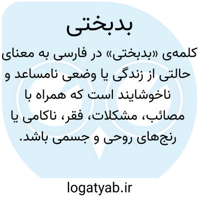 کلمه‌ی «بدبختی» در فارسی به معنای حالتی از زندگی یا وضعی نامساعد و ناخوشایند است که همراه با مصائب، مشکلات، فقر، ناکامی یا رنج‌های روحی و جسمی باشد. این واژه از ترکیب «بد» به معنای نامطلوب یا ناپسند و «بخت» به معنای سرنوشت یا قسمت تشکیل شده است، و نشان‌دهنده سرنوشت یا حالت نامساعد فرد است. بدبختی می‌تواند در زندگی شخصی، اجتماعی، مالی یا عاطفی فرد ظاهر شود و معمولاً با غم، ناراحتی و مشکلات مداوم همراه است. در ادبیات فارسی، این واژه برای توصیف وضعیت کسانی به کار می‌رود که از شانس و سعادت دور مانده‌اند و زندگی دشواری دارند. از نظر اجتماعی، بدبختی ممکن است به فقر، بی‌کسی، ناتوانی یا محرومیت اشاره داشته باشد و فرد را از موقعیت‌های بهتر زندگی محروم کند. این واژه معمولاً بار معنایی منفی دارد و برای بیان رنج و گرفتاری‌های انسانی به کار می‌رود. در مکالمات روزمره، بدبختی می‌تواند هم شامل حوادث ناگوار باشد و هم احساس درونی نارضایتی یا درماندگی فرد را بیان کند. هم‌معنی‌های آن شامل بی‌بختی، فلاکت، بدروزگاری، ناکامی و رنج هستند.