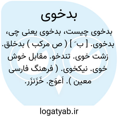 بدخوی. [ ب َ ] ( ص مرکب ) بدخلق. زشت خوی. تندخو. مقابل خوش خوی. نیکخوی. ( فرهنگ فارسی معین ). اَعوَج. خَزَنزَر. خُنُدب. شِغّیر. شِنّیر. شَکِس. شَکِص. صَنّارة.عَبقان. عَبقانَة. عَدَبّس. عِض. عِظیَر. عَفَرجَع. عَفَنجَش. عُقام. عَکَص. قاذورة. لَعو. مُعَربِد. وَعِق. هَزَنبَز. ( منتهی الارب در ذیل هر یک از کلمات مزبور ). سَیِّی ءالخلق. ( یادداشت مؤلف ):