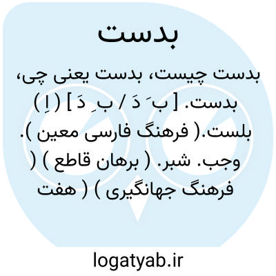 بدست. [ ب َ دَ / ب ِ دَ ] ( اِ ) بلست.( فرهنگ فارسی معین ). وجب. شبر. ( برهان قاطع ) ( فرهنگ جهانگیری ) ( هفت قلزم ) ( شرفنامه منیری ) ( ناظم الاطباء ). وجب که گشادگی پنج انگشت یک کف دست باشد. شبر. ( انجمن آرا ) ( از آنندراج ). از سر انگشت کوچک تا سر انگشت نر. بالشت. «بهندی ». ( از غیاث اللغات ). به اندازه نوک ابهام تا نوک انگشت کهین چون پنجه تمام گشاده باشد. شبر. وجب. اِلب. ( یادداشت مؤلف ):