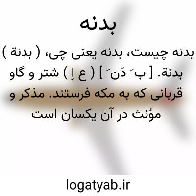 ( بدنة ) بدنة. [ ب َ دَن َ ] ( ع اِ ) شتر و گاو قربانی که به مکه فرستند. مذکر و مؤنث در آن یکسان است. ( منتهی الارب ) ( آنندراج )( ناظم الاطباء ). ماده شتر یا ماده گاو که در مکه نحر شود و چون آنها را تناور و پروار می کردند از آن بدنة نامیده اند و از آنجاست: «اراک اَضعف السدَنة و انت فی قدِ البدنة». ( از اقرب الموارد ). آنچه قربان کنند.( مهذب الاسماء ). کشتار و قربانی از نوع شتر و گاو که به مکه برند قربانی را و نر و ماده هر دو را بدنة گویند. فسیکه. ذبیحه. ( یادداشت مؤلف ). ج، بُدُن. ( منتهی الارب ) ( آنندراج ) ( ناظم الاطباء ) ( مهذب الاسماء ). || بقیرة و آن پیراهنی است بدون آستین که زنان پوشند. ج، بدنات و بُدُن. ( از اقرب الموارد ). بدنه: و زبیده بدنه ای بمروارید بافته ببوران اندرپوشید. ( مجمل التواریخ و القصص صص 354 - 355 ).