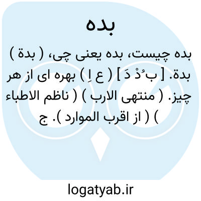 بده. [ ب ِ دِه ْ ] ( اِ ) چیزی که بر ذمه شخصی بود و شخص ملزم بر دادن آن باشد. ( ناظم الاطباء ). دین. بدهی. وام که ستده باشند. مقابل بستان و طلب. ( از یادداشتهای مؤلف ).