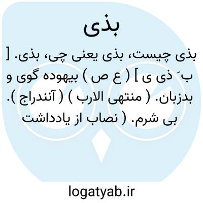 بذی. [ ب َ ذی ی ] ( ع ص ) بیهوده گوی و بدزبان. ( منتهی الارب ) ( آنندراج ). بی شرم. ( نصاب از یادداشت مؤلف ) ( مهذب الاسماء ). مرد فاحش بی شرم. ( غیاث اللغات ). ناسزاگوی. ج، ابذیاء. ( از اقرب الموارد ). هرزه گوی. ( یادداشت مؤلف ).